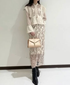 「マイダイアリー」で吉川愛さんが着用していたセットアップ(ブラウス&スカート)はLILY BROWN エンブロイダリースイッチングブラウスとラインタイトスカートです。