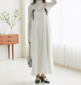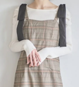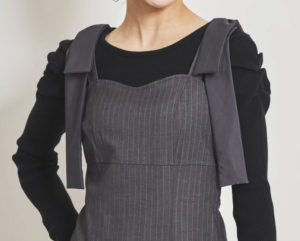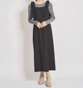 ジャンパースカートはシルエットがきれいなペンシルラインで、肩リボンがキャッチーなデザインになっています。