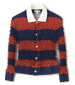 凹凸が特徴のふくれジャカードがドッキングされているニットトップス。