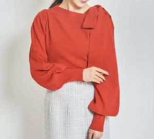 パフスリーブのワンショルニットに取り外しのできる大きなリボンがついたニットTOPSです。