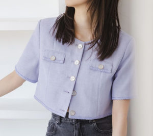 キラキラとしたラメを織り交ぜたサマーツイード生地を使ったクロップド丈のジャケットです。