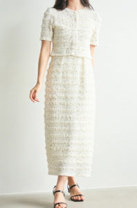 トレンドのモチーフリボンをふんだんにトッピングしたコンパクトニットと、シルエットのきれいなタイトスカートのニットセットアップです。