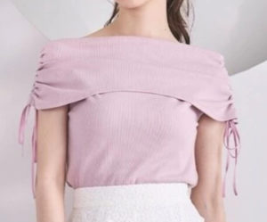 ドロストリボンが可愛らしいギャザーデザインのオフショルカットソーです。