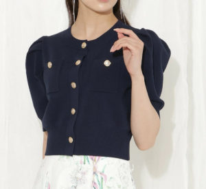 ふんわりとしたパフスリーブが可愛らしさを引き立てる、上品なショート丈カーディガン。