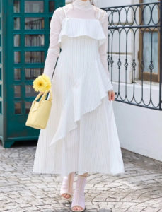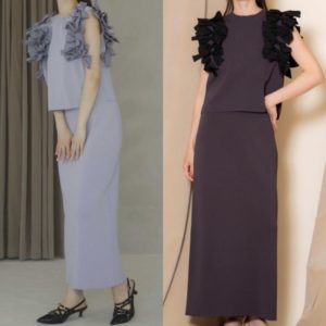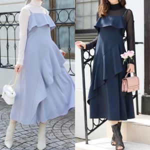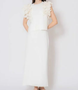 バスト周りのフリルが目線を上にあげ、立体的なフリルとの対比でウエストはすっきりとした細見えを叶えます。