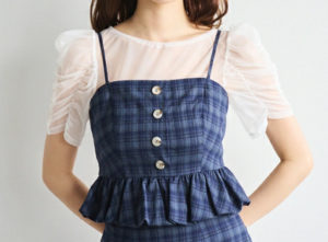 チュールで仕立てたシアーインナーとペプラムシルエットのビスチェのセットアイテム。