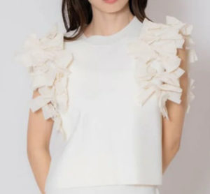 立体的なフリルデザインがフェミニンムードを後押ししつつ、衿元のビジュー釦がアクセントを添え、上品な華やかさを演出します。