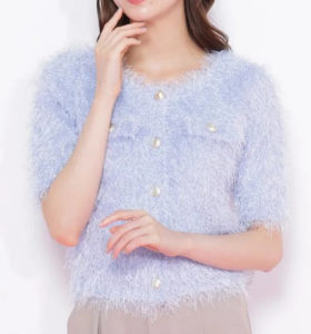フサフサのフェザーヤーンとラメ糸を引き揃えて編んだトレンド感のある半袖ニットジャケット。