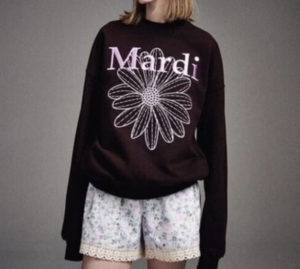 Mardi Mercrediのシグネチャーデザイン「FLOWER MARDI」が立体的な刺繍で施された、オーバーサイズのスウェットプルオーバーです。