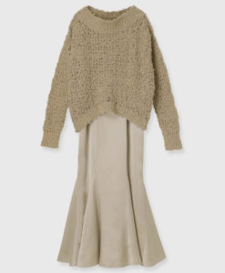 オフショルダーのニットプルオーバーとサテンキャミワンピースがセットになったアイテムです。