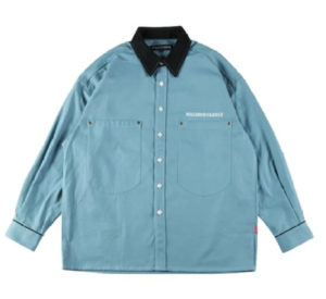 ノーカラータイプなので、インナーにシャツやフーディなどを重ねたレイヤードスタイルも楽しめます。