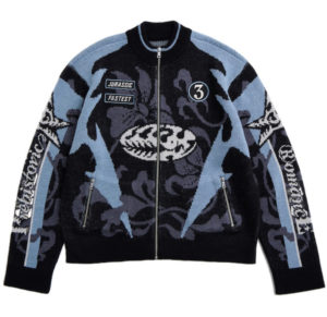 アーティスト D.3.C とのコラボレーションによる、レトロレーシングジャケットから着想を得たニットジャケットです。