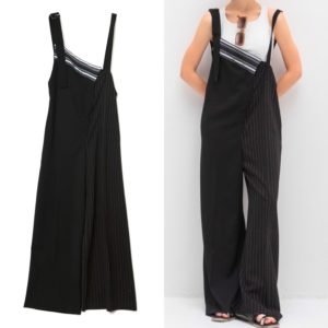 素材もデザインもアシンメトリーサロペットで、胸部分の斜めのマーベルト風ストライプ生地にテープを叩いたデザインがポイントです。