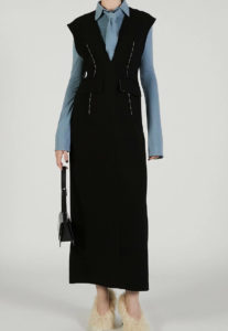 直線的なシルエットにハンドステッチディテールがアクセントになったモードなロングワンピース。