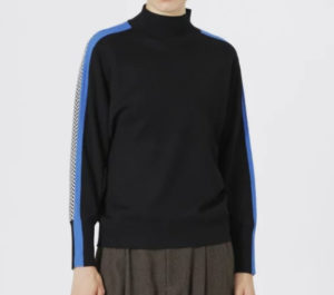 袖のカラーブロックのレイヤードデザインが目を惹くハイネックリブニットです。