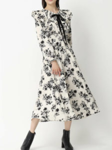 ひらひらとしたプリーツカラーがクラシカルな印象を与えるワンピースです。