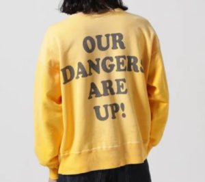 バックには「OURDANGERSAREUP」とメッセージプリントが入っています。