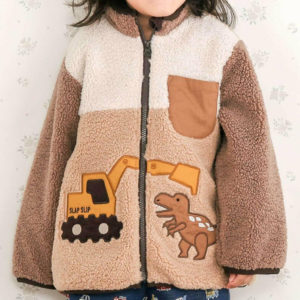 もこもこのボアにショベルカーと恐竜のパッチが可愛いジャケット。