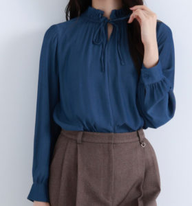 襟元が立ち上がったフリルとリボンとギャザーで、ジャケットインにも映える華やかなブラウス。