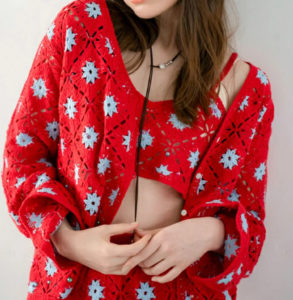 夏らしい華やかな配色の編地と、カラフルなクリアビーズが目を惹くカーディガンです。
