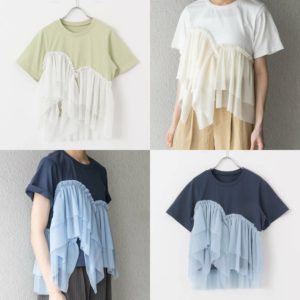 ベーシックなTシャツに、表面感のあるシアー素材をアシンメトリーにドッキングさせたTシャツです。
