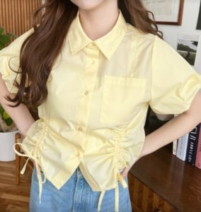 くしゅっとシャーリングを施したリボンデザインが目を惹くシャツ。