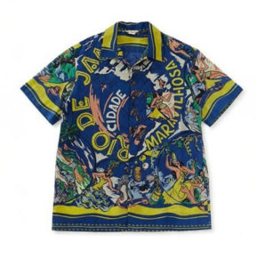 バリ島にまつわるアイコンを手書きのグラフィックで散りばめたオリジナルプリント柄を用いたアロハシャツ。
