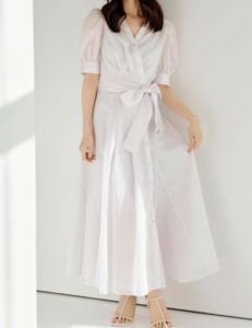 ウエスト位置切り替えからのフレアシルエットと上見頃のすっきりとしたカシュクールデザインでメリハリをつけた、エレガントなシャツワンピース。
