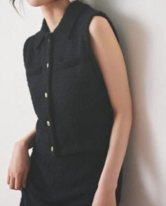 フロント部分にはメタルのドットボタンを打ち、レディライクなツイードジャケットにハードさをプラスしたデザインになっています。