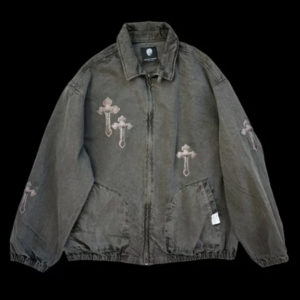 ヴィンテージライクなワークジャケットをベースに、ブランドを象徴するクロスモチーフのアップリケを全体に配置しています。