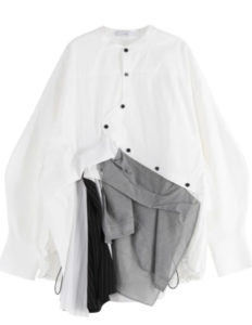 ランダムに入れたタックや変形の前立てデザイン、コクーン型のシルエットが立体的なデザインを生み出しています。