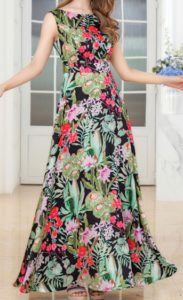 鮮やかなボタニカル&フラワープリントが印象的なAラインロングドレス。