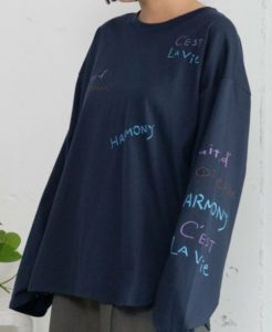 フロントと袖にランダムに入れたカラフルな文字プリントとミシン刺繍が目を惹くTシャツ。