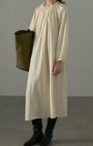 たっぷりとギャザーを寄せたネックラインが印象的な、クラシックムード漂うロングワンピース。