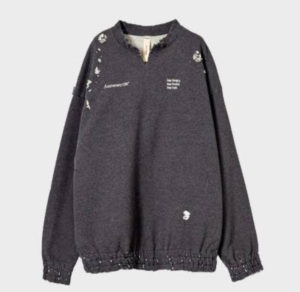 ネックだけでなく、背面や袖にもダメージ加工を施しているルーズスウェット。