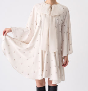 柔らかいジョーゼット素材を使用し、動くたびに優雅なシルエットを演出します。