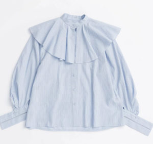 肩から胸元にかけた大胆なラッフルで360度抜かりない存在感を演出するフリルブラウス。