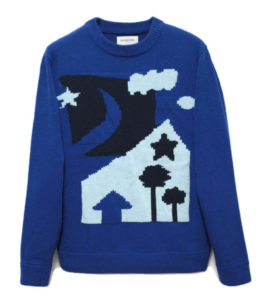 星と雲、月明かりに照らされる家や大きな木を描いた手書きデザインをニットの織りにより表現しています。